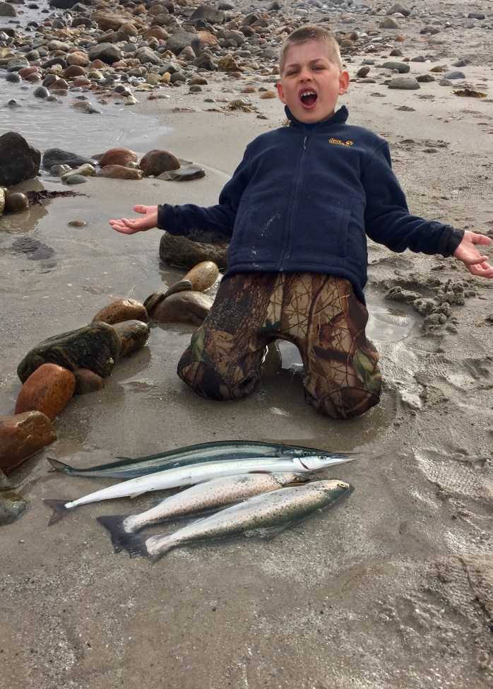 Emil fik flere hornfisk på spinnestang men han er altid frisk på en fluestangs-fight. Mit fluestangkoncept er at ‘jeg kroger og Emil fighter’. Det virker rigtig godt og han er top-motiveret.