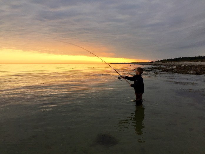 Min søn Emil var 120% tændt på at vi skulle fange noget og kom hurtigt i vandet med hans spinnestang.