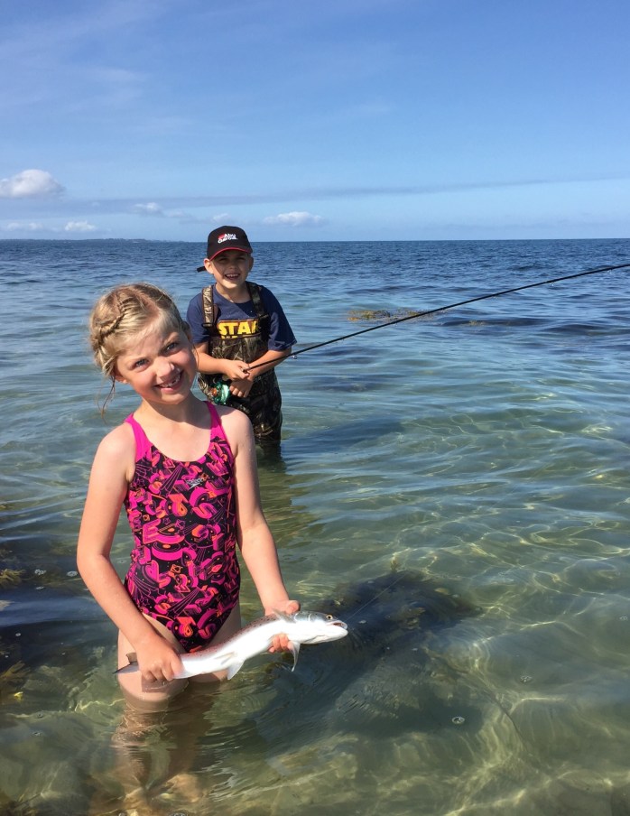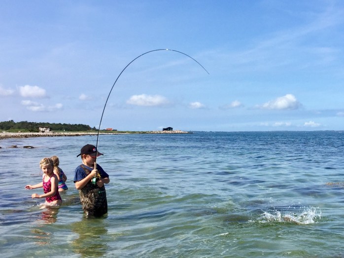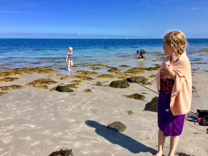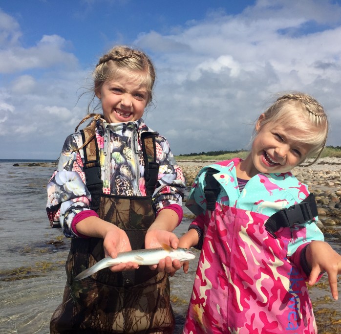Tirsdag morgen var det endelig strandvejr og ungerne var klar til en strandtur. Pigerne var hurtig klar med badetøj og min søn Emil havde vaders og fiskestang klar.