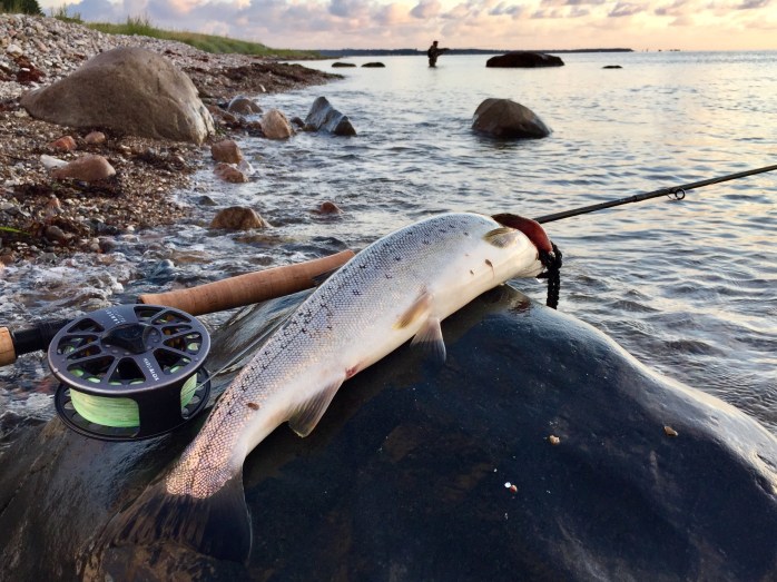 Det var en fantastisk morgen og vi så en del pæne havørreder helt fri af overfladen lige fra start. Den hårde vestenvind havde gjort det umuligt at fiske på den åben kyst.