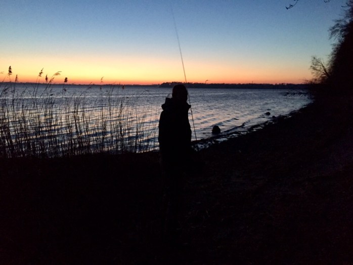 Vi prøvede så helt oppe ved Lammefjordsdæmningen i den sydlige ende. Der var masser af ørredyngel (10-15 cm) i overfladen helt inde ved dæmning på begge sider af den ‘knold’, der er der. Jeg tænkte, at når der er små fisk, er der måske også store fisk. Min makker vadede over udløbet og prøvede længere ude.