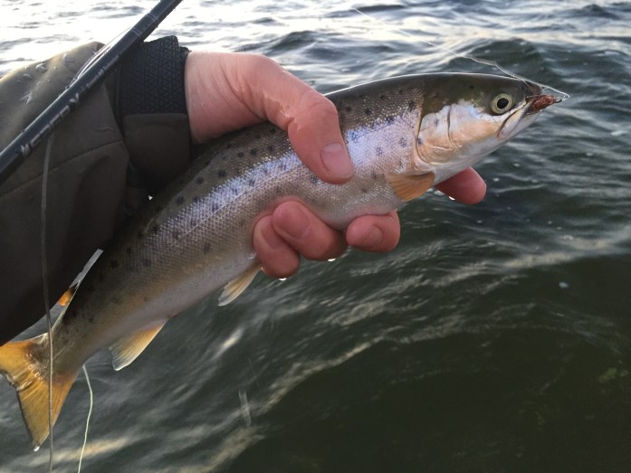 Jeg stod så i vandet ude på kanten af knolden og fiskede ind mod dæmningen og sørme om spotet ikke gemte en pæn ørred et par centimeter over målet. Den ørred afsluttede en fangsttørke på mere end et år, så selvom fisken ikke var kolossal, så var jeg rigtig glad for den.