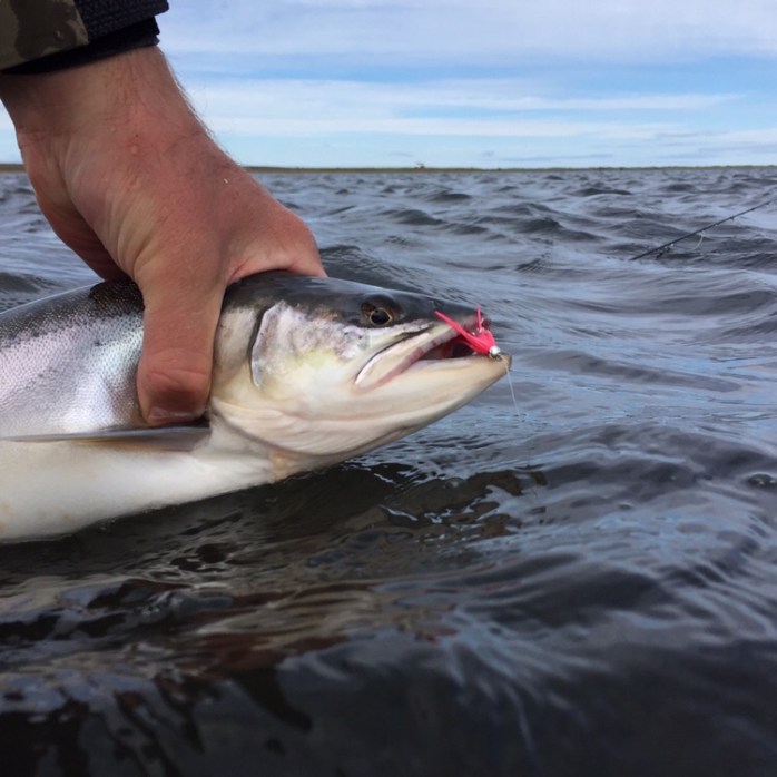 Helge Rødgaard Larsen prøvede lige en guldbasse-flue i eleven. Det gav et super hug på en meget flot fuldfinnet Steelhead (havgående regnbueørred). Herunder ses den flotte fisk som lokale mand Eljearn holder.