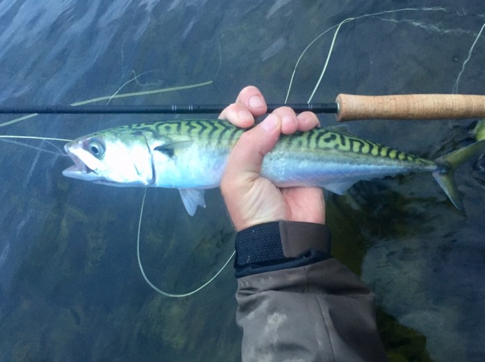 Første seriøse nap i var en fin størrelse makrel som må siges at være en ultra fighter på fluestangen. Den tog helt inde under land hvor den havde været på jagt i fiskestimerne.