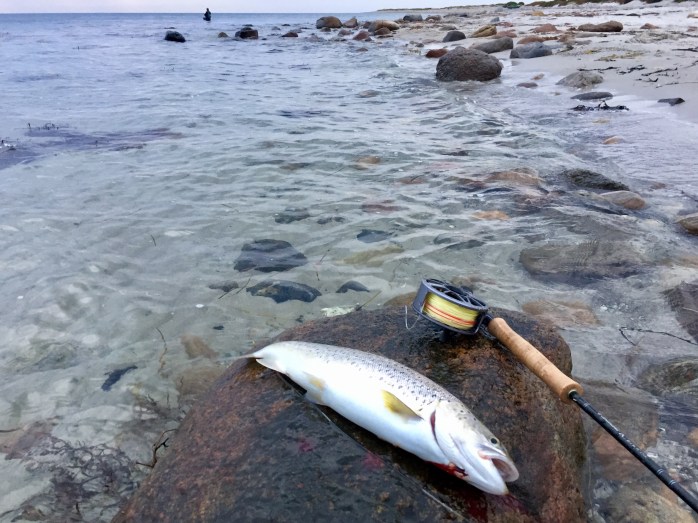 En halv time senere kom der hårdt ryk linen under hurtig indtagningen med guldbassen (flue). En fin havørred hoppede helt fri af vandet lige efter at den havde taget fluen. Man kunne ikke mærke at den var præget af det varme vand. Det fisken kom i land målte den 50 cm og var en rigtig flot sommermodel af en havørred.