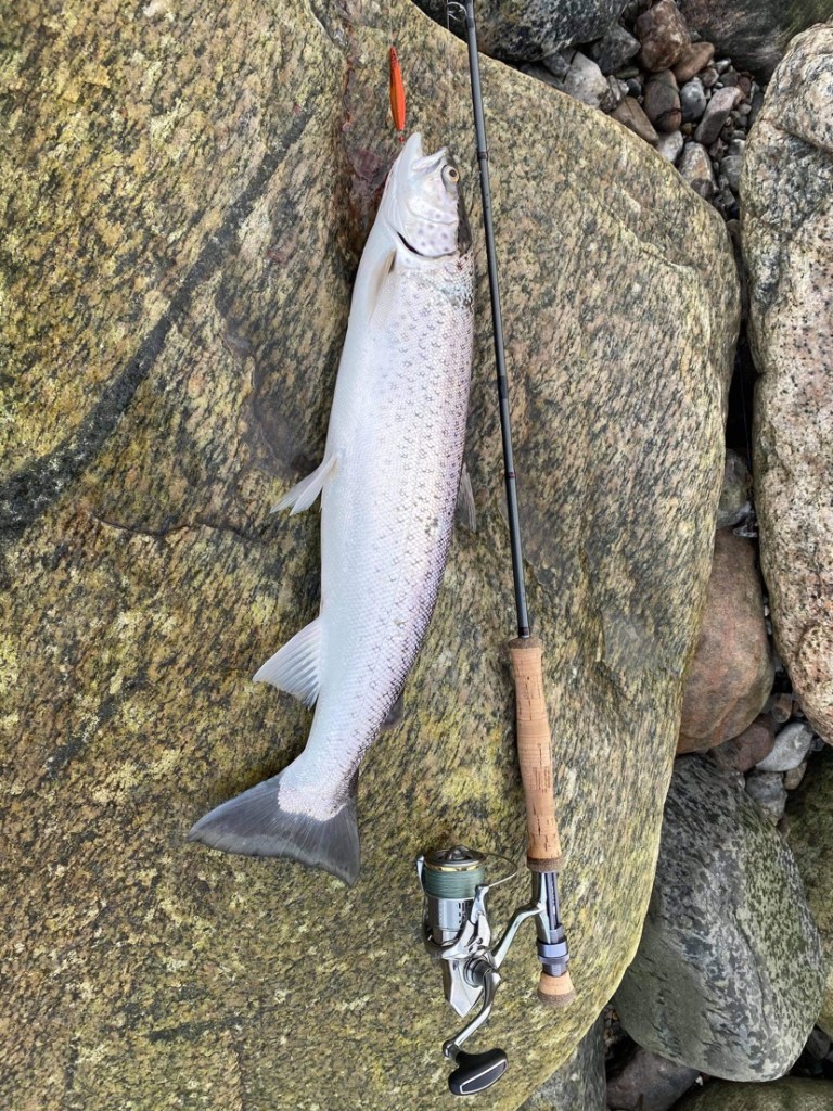 Jeg modtag denne flotte fangstrapport fra min fiskekammerat Per Søholt første januar. Per havde taget lidt frisk luft på et af de lokale spots med det nye enhånds UL spinnesæt. Stangen var en Loop Cross fluestang, klasse 6 med et spinnehjul monteret. Per ville gerne hurtigt kunne skifte mellem spin og flue uden at skulle helt ind til land når der vades langt ude i lavvandet områder.