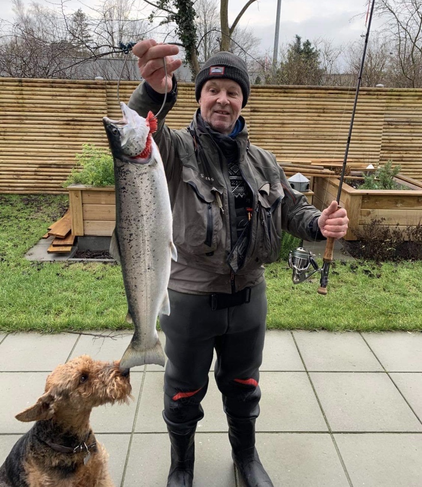 Per Søholt med endnu flot stor-ørred fra Nordkysten. Hunden ‘Ludvig’ slikker sig om munden:-).