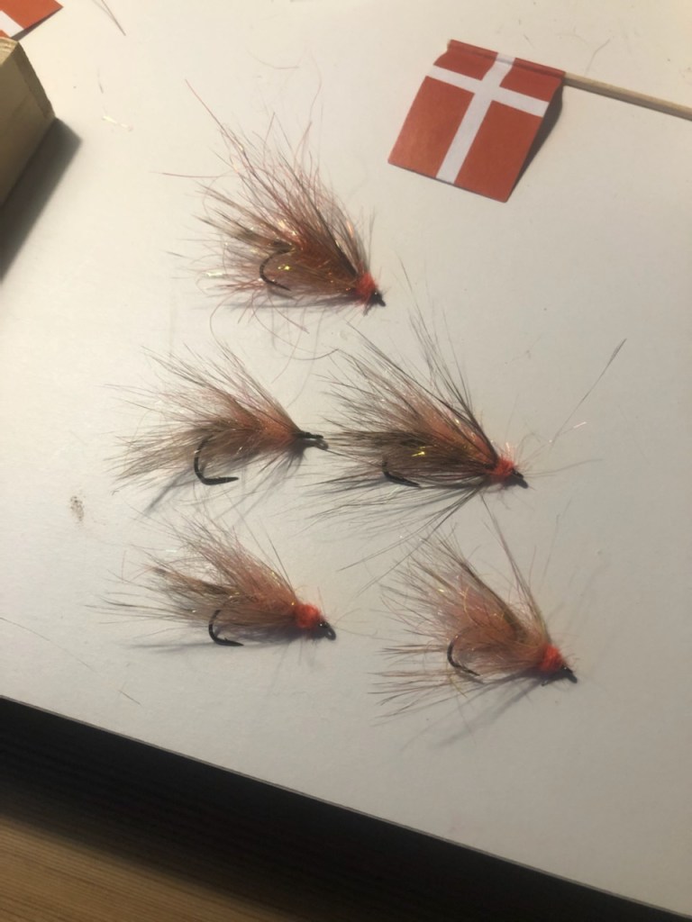 Fluen ‘dyret’ er bundet med en lyserød ting m grizzle spey hackel, str 4