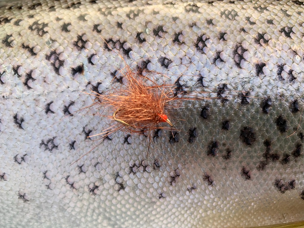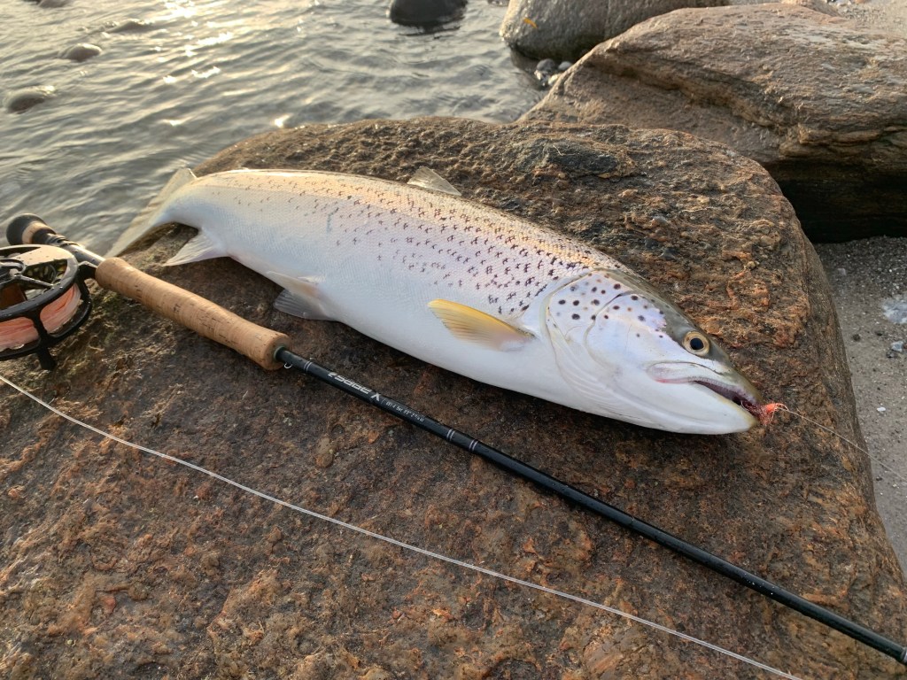 Min planlagte morgenfisketur til nordkysten gik i fisk da en en stor flot overspringer på 60cm tog min kobberbasse-flue helt ude i kastet. Efter en vild fight med mange udløb kom fisken på land.