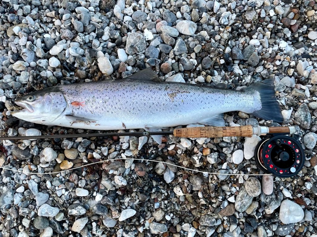 Efter kun 6-7 kast med fluenstangen kom der et god hug i fluen. Jens Peter kunne efter god fight lande super flot havørred på hele 69cm og 3,2 kg. Det er virkelig flot blank overspringer med løse skæl. Stort tillykke med fangsten til Jens Peter.