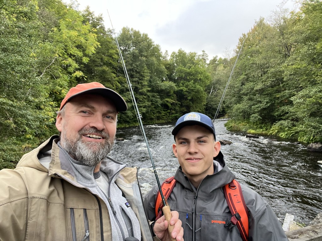 Fiskekammaraterne Søren (brormand) og Peter svinger og fluestangen på et af de øvre-stræk 🎣 i elven (Vittskövle).