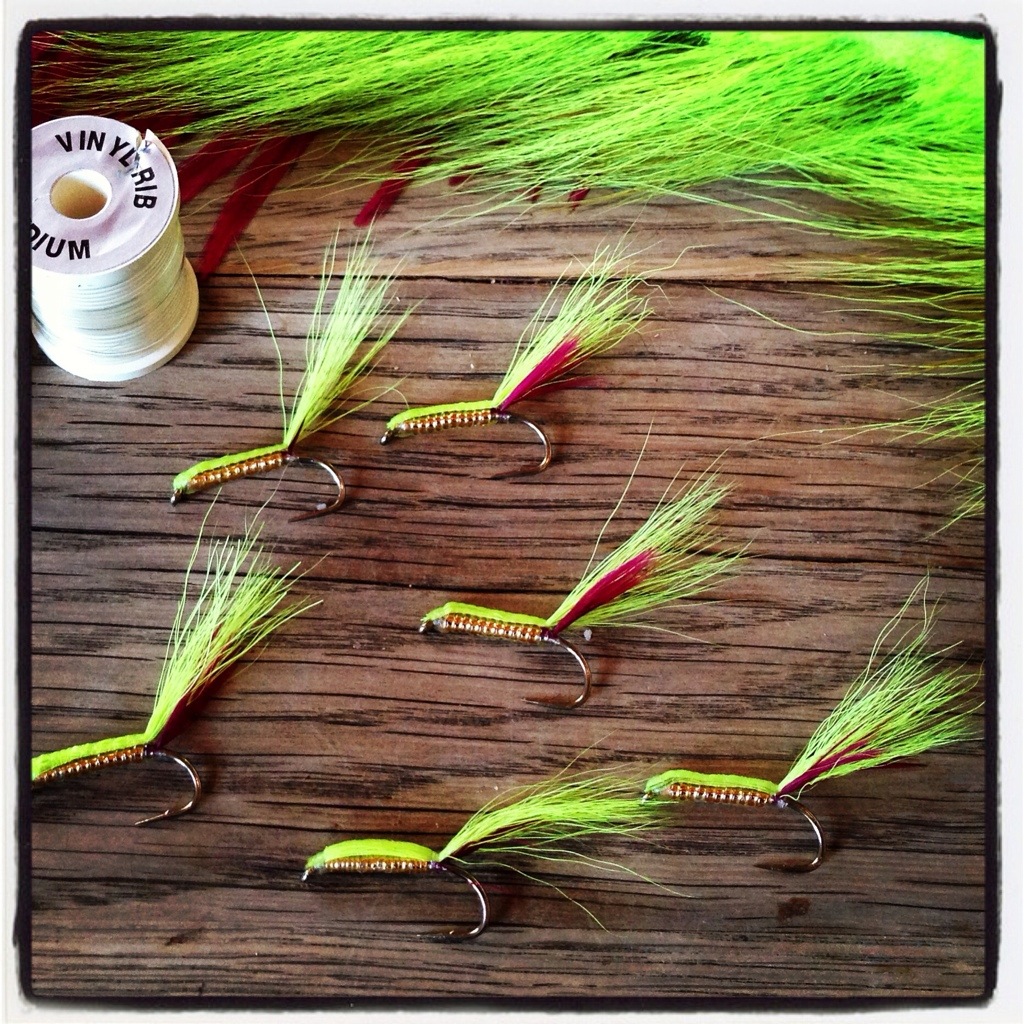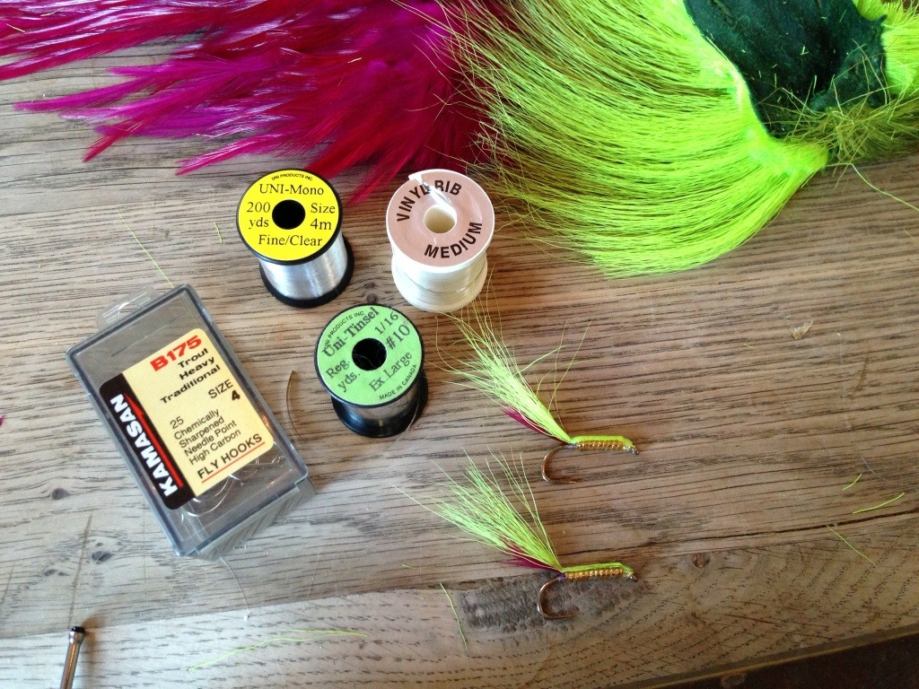 Vinge: Fluo-grøn (chartreuse) bucktail. Indbindes til sidst