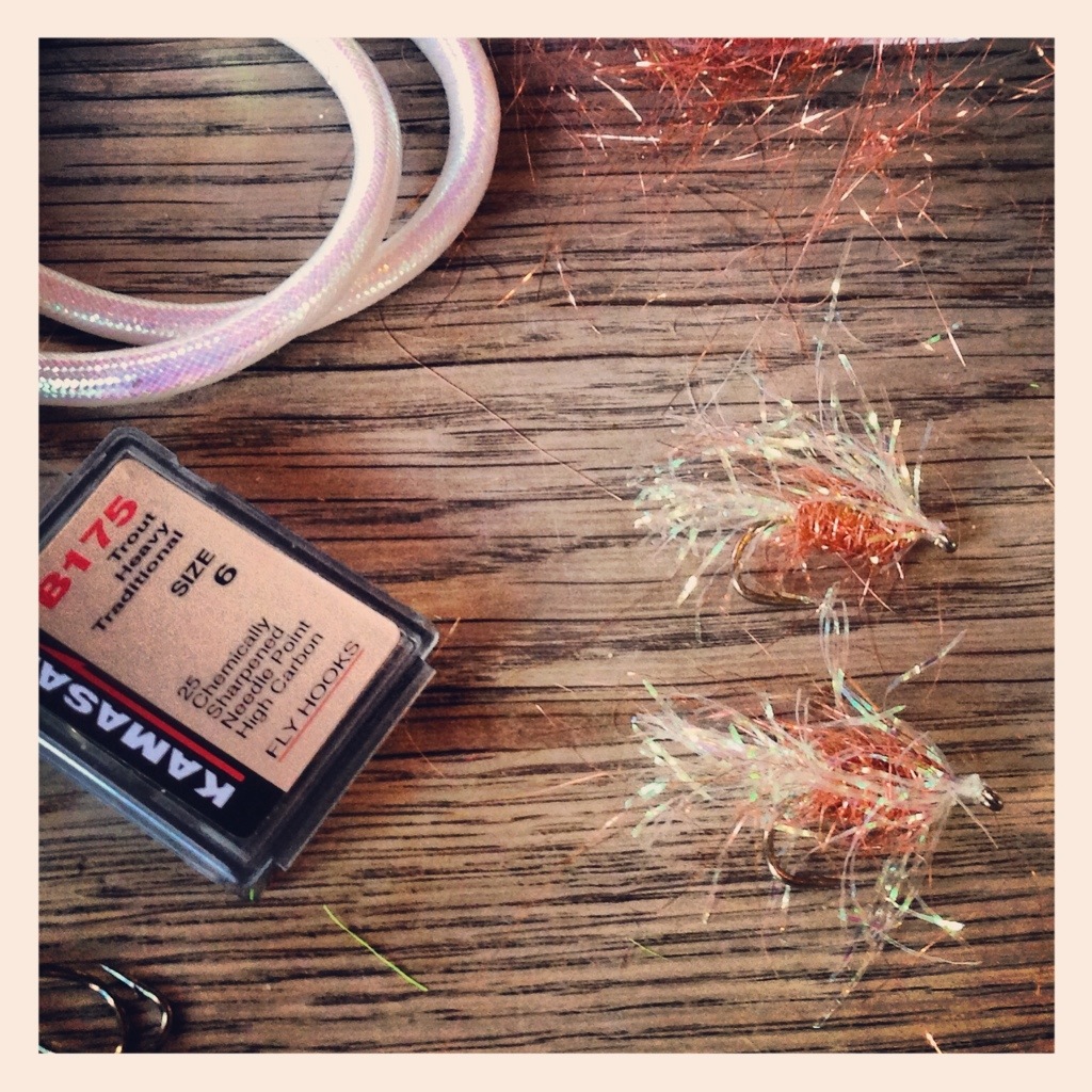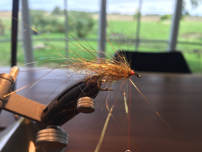 Efter at have læst alle dine lovpriser omkring den “Fantastiske Kobberbasse”, havde jeg været lidt kreativ bag fluestikke og (i mangel på andet) blendet en omgang rød/kobber Angel Flash til det der så blev “Rødbassen”.