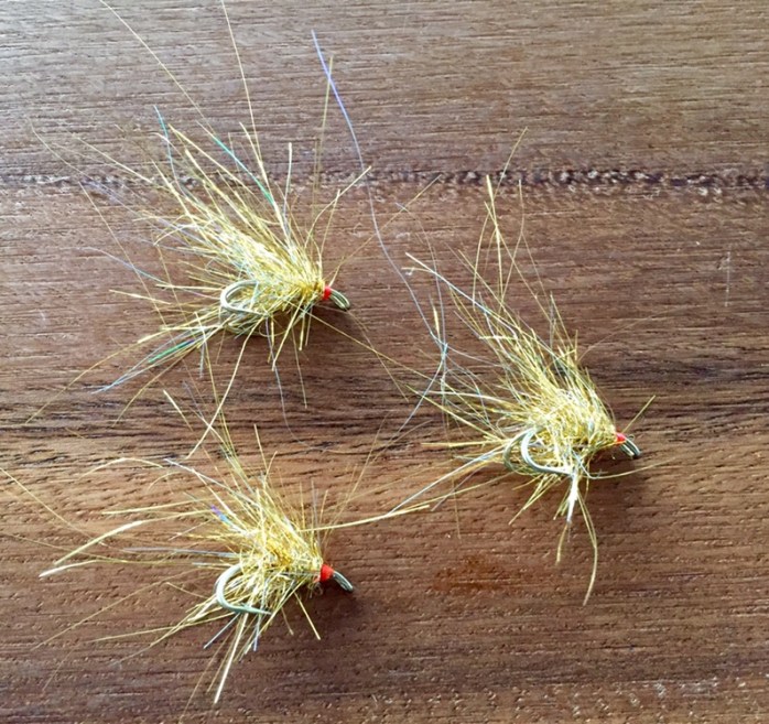 Min version af Guldbassen er igen en meget enkel flue, hvis eneste bestanddele er dobbeltkrog, vægtbelæstning og gulddubbing. Den fiskes ligesom kobberbassen hurtig og med lang indtagning.