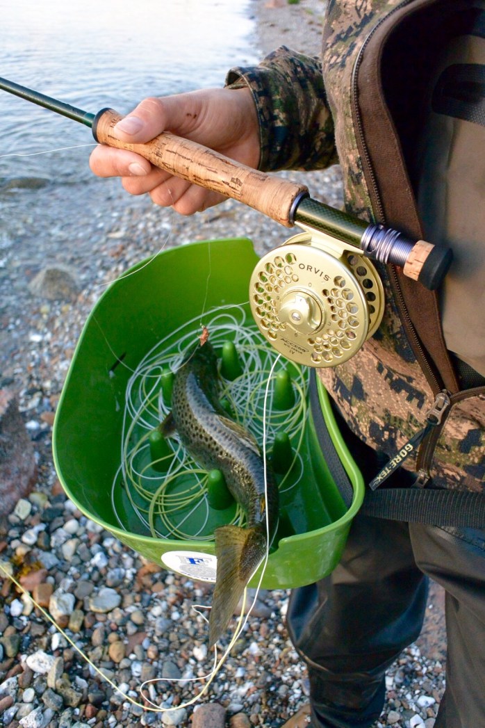 Det var en fantastik smuk morgen dom vi kunne nyde mens vi så på alt det liv der er i vandet. Det kan godt virke lidt uoverskueligt at finde havørreden med en lille kobberbasse-flue for enden af forfanget. Heldigvis er havørreden skrappe til at spotte vores agn når de tages hurtigt ind. Der blev fisket igennem og vi fik overlistet nogle havørreder de første timer.