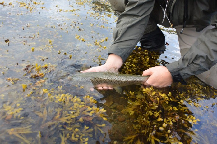 Det var en fantastik smuk morgen dom vi kunne nyde mens vi så på alt det liv der er i vandet. Det kan godt virke lidt uoverskueligt at finde havørreden med en lille kobberbasse-flue for enden af forfanget. Heldigvis er havørreden skrappe til at spotte vores agn når de tages hurtigt ind. Der blev fisket igennem og vi fik overlistet nogle havørreder de første timer.