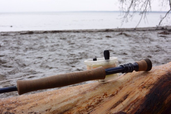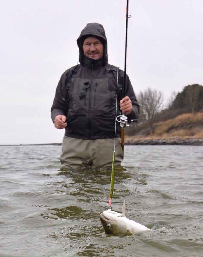 Vinden gjorde at jeg måtte fiske langs med land men det gjorde ikke noget da havørrederne var helt inde under land i de hårde vejr. I andet kast var der kontakt med fisk. Jeg så lige en blank-side vende i vandet 10 meter ude. Desværre fik fluen ikke ordentlig fat i det urolige vand. Lidt senere kom et godt ryk i Zpey-linen og fin blankfisk sprang fri af vandet.