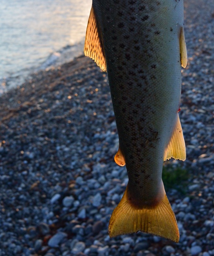 Det var en fed havørred på 45 cm som blev brugt til undervisningsbrug da jeg skulle vise hvordan man afliver en havørred hurtigt samt hvordan man monterer en fangst-læderrem.