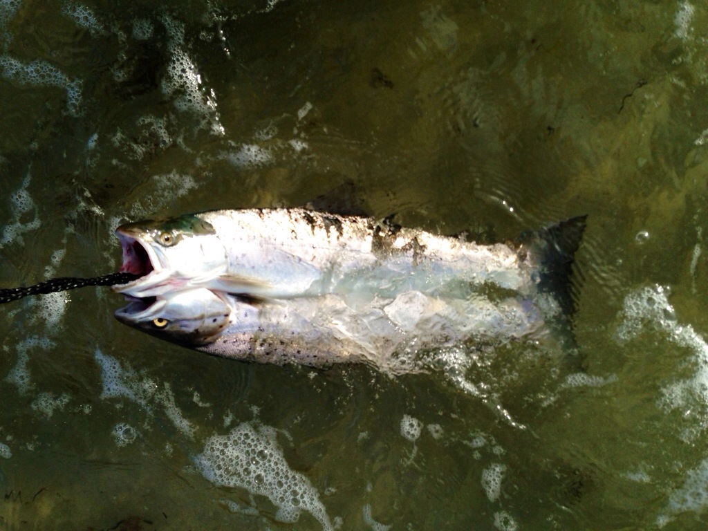 Efter ca. 20 minutters fiskeri på den nye plads, ser jeg en stor hvirvel lige da jeg holder pause mellem indtagningerne af kobberbassen, og da jeg trækker i fluelinen igen, mærker jeg et kontant modtræk. En god blank fisk på 50-60 cm ryster hovedet et par gange og tager så et udløb som tager de 10-15 meter løsline jeg har liggende i vandet. Netop som løslinen er ude og jeg lægger hånden på hjulet slipper fisken – troede jeg da. Da jeg trækker linen hjem mangler jeg både flue og ca. 30 cm af forfanget.