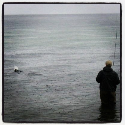 Min fiskekammerat Danny var først til spotte en flok ørreder der viste sig i overfladen. De er dog ikke altid nemt at fange deres opmærksomhed under disse forhold og det endte med at flokken svømmende videre langs kysten. Senere var mig der så lidt overflade aktivitet men desværre alt for langt ude selvom den fluestangen fik hele-armen:-)