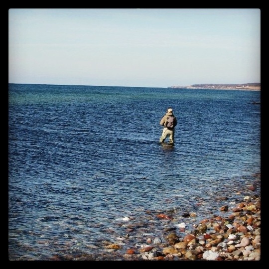 “1.marts højt solskin og alligevel en skarp vind fra nordvest. Der er stadig is i fjorden og nordvest er aldrig godt så tidlig på sæsonen. Og alligevel…..kunne man finde et sted i Sydøstsjælland med vinden i ryggen og solen bagende ind på kysten ku det nok lokke lidt aktivitet ind på det kystnære vand. Jeg havde aftalt en fyraftentur med min fiske-buddy og gode ven Peter Paranowski. Da vi ankom så det perfekt ud. Let farvet vand. God rygvind og normal vandstand. Bare det at være der og på det tidspunkt var perfekt. Nu manglede bare fisken…..egentlig ikke. Det var bare rart at være på rigtig sted og tid…..luksus i en ellers travl hverdag.;-) vi fik en lille til halsen og snakkede om løst og fast. Kravlede i wadersene og gik ned til vandet. Der var andre fiskere ude, men nattens frost og aftagende måne havde nok lagt en dæmpet på fiskene, men vi fiskede løs ….ingen fisk . Efter 3 timer uden hug blev vi enige om at tage en travetur op ad kysten. Vinden der kom ind fra højre fik det lidt opvarmede vand til at strømme hen over et rev en km til venstre så vi gik der hen ad. Vel fremme blev vi enige om at give området et forsøg. Jeg bandt en ekstra stor kobberbasse (Stinger. 3 krog) på, da det var meget gang i vandet og pænt dybt. Peter gik til højre på det første rev og jeg tog området i baglandet inden det andet rev. Der var store sten og tang i badekarret inde ved land, men ikke højt nok vand til at fiske det af så jeg vadede ud til 1. Revle. 3 kast smakk….. En stor fisk rullede i overfladen….. Jeg kunne mærke den var stor men det kolde vand lagde en dæmper på fighter. Efter 5 minutters drinken gennem tangplanter og mellem sten blev fisken kanet. Sikke en smuk start på foråret…….:-)”