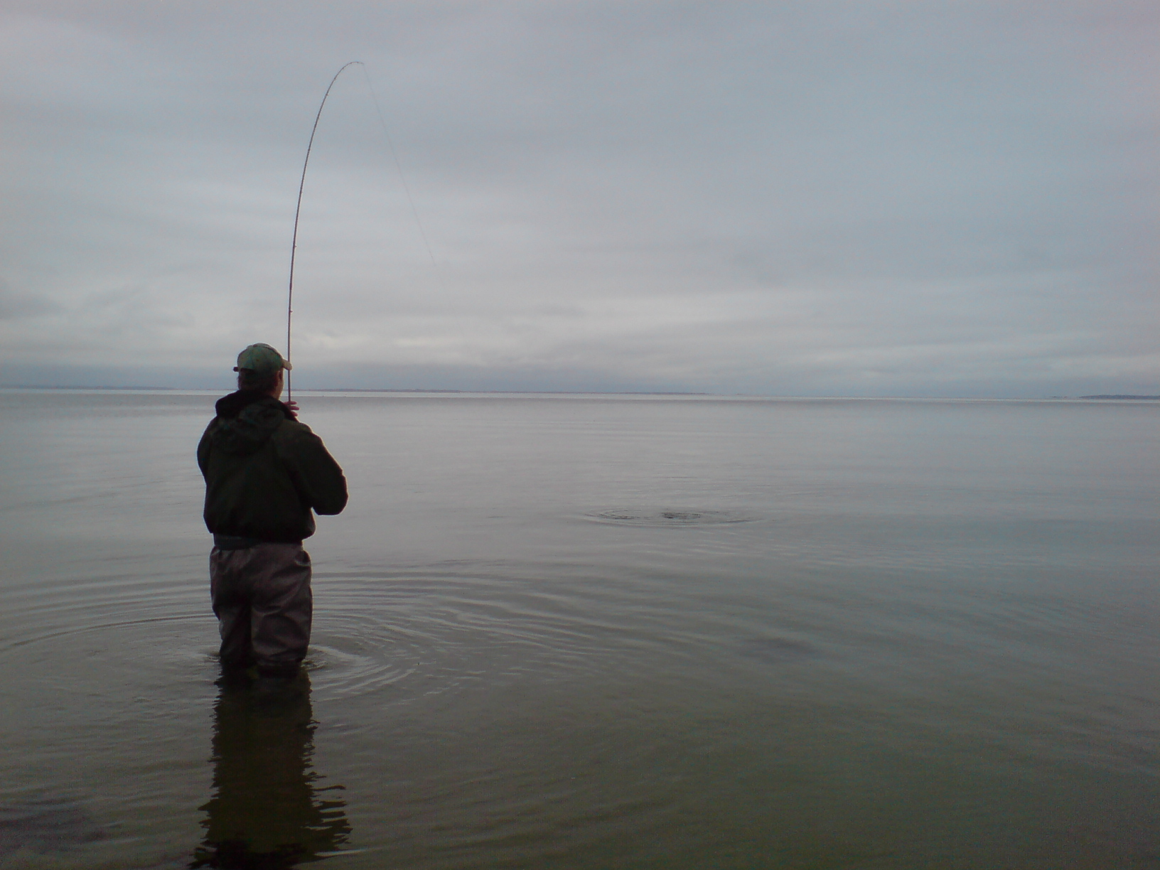 Denne morgen var Claus og jeg taget til en af fiskepladserne i den sydlige del af fjorden hvor vi blev mødt af en meget tom fjord. Der manglede omkring 1 meter vand i forhold til den normale vandstand. Vi gennemfiskende de mudderbundsområder der så bedst ud og det gav succes. Fiskene havde samlet sig en lille område på 15×15 meter. I løbet af en time fik 6 blanke havørreder og vi mistede en del da de tog forsigtigt tæt på bunden. Havørrederne var sikkert på jagt efter børsteorm:-).