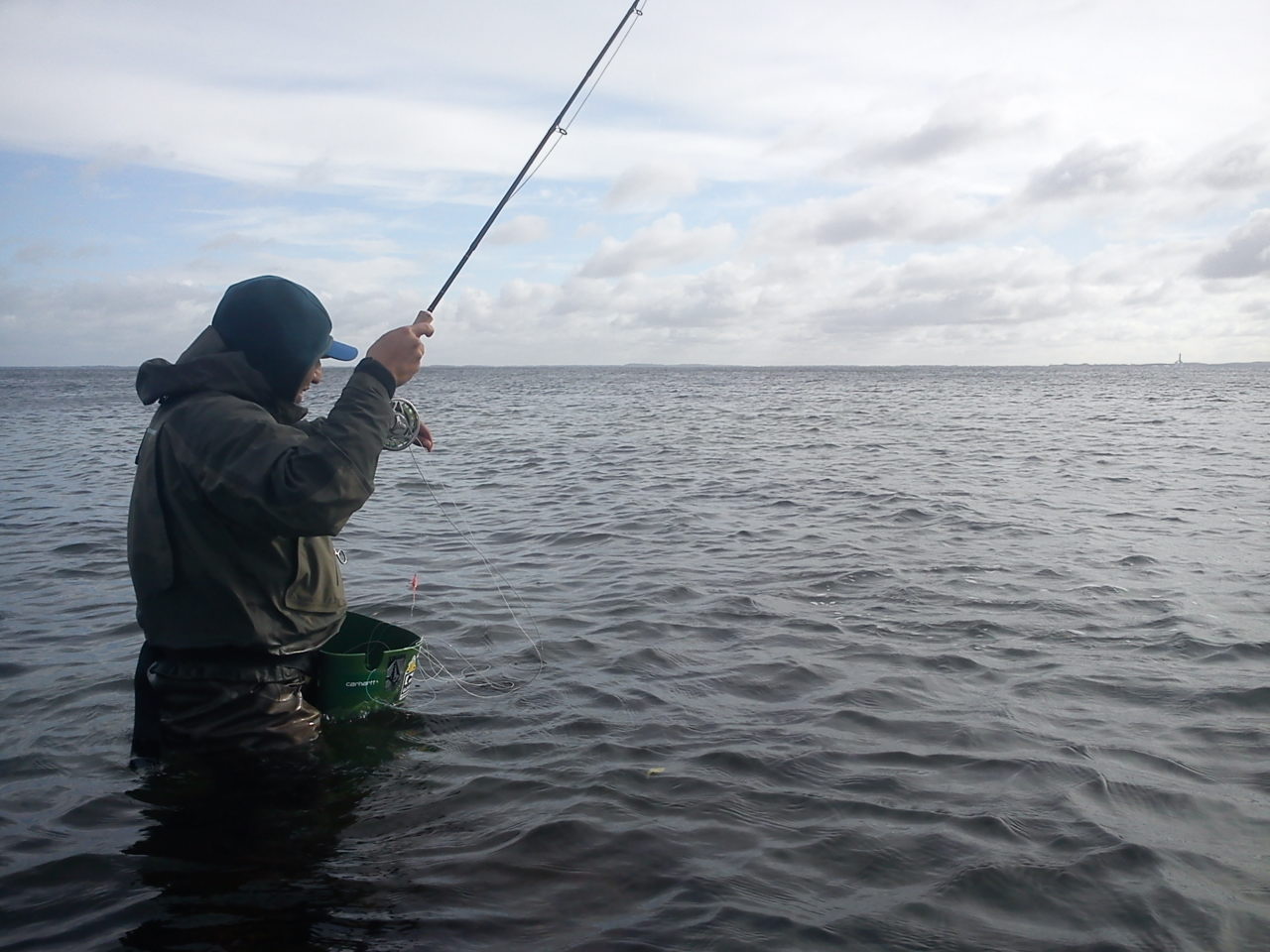 På vej ned langs stranden så jeg alle de små sorte fluer flyve rundt . Jeg studerede overfladen og kunne se at der var mange der havde ramt overfladen. Tankerne kom hurtig tilbage til lignende situationer hvor de små sorte havde fået havørrederne til at tage “tørfluer” i overfladen. Da vandet var som et spejl var det nemt at spotte eventulle havørreder på æde-togt. Jeg fandt en god plads til Rebbeca i barnevognen da hun skulle have en eftermiddagslur. Da hun tog sig en lur var tid noget spot-fishing .